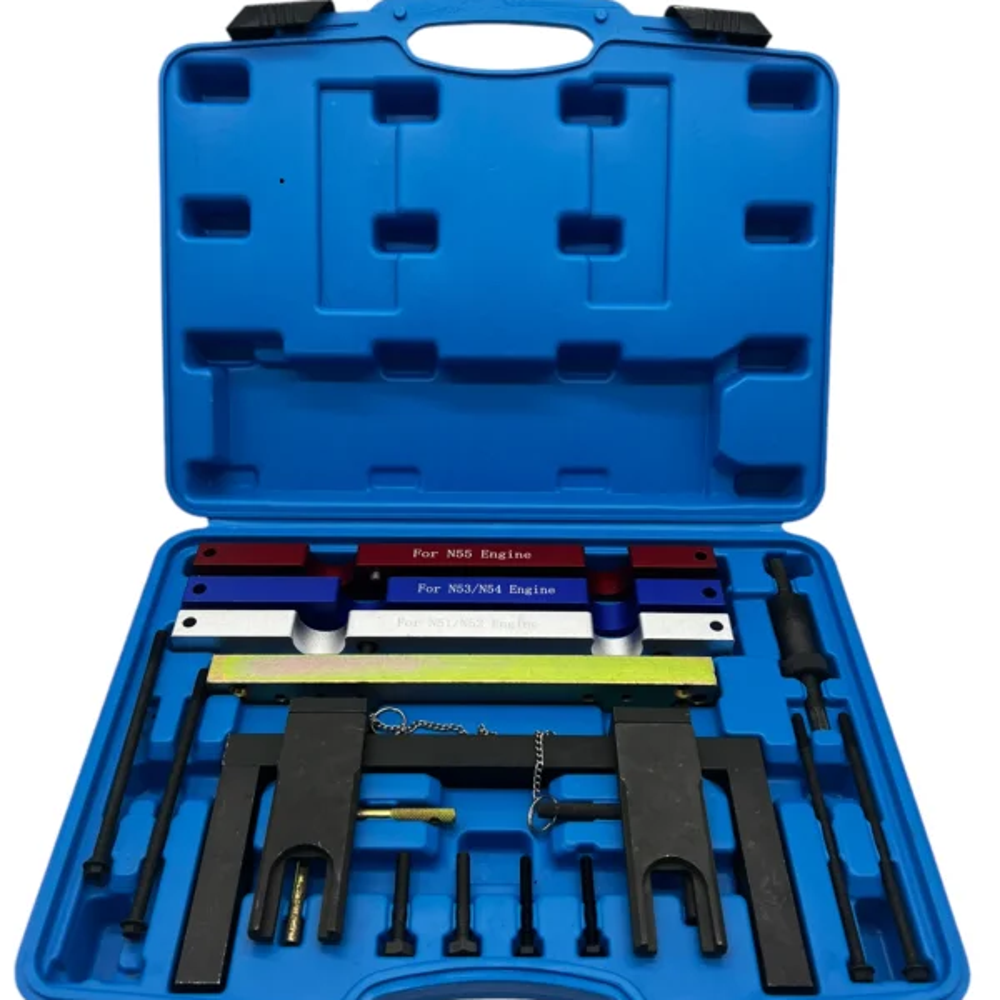 Ovaj profesionalni set alata za podešavanje motora tvrtke Brand7 idealno je rješenje za precizan rad na benzinskim motorima BMW N51, N52, N53, N54 i N55. Dizajniran za upotrebu u neovisnim radionicama, automehaničarskim radionicama i ambicioznim mehaničarskim garažama, ovaj 22-dijelni specijalni alat omogućuje precizno zaključavanje i podešavanje bregastih vratila, radilica i dvostruke VANOS jedinice – što je neophodno za promjenu lanca razvoda i provjeru vremena.
