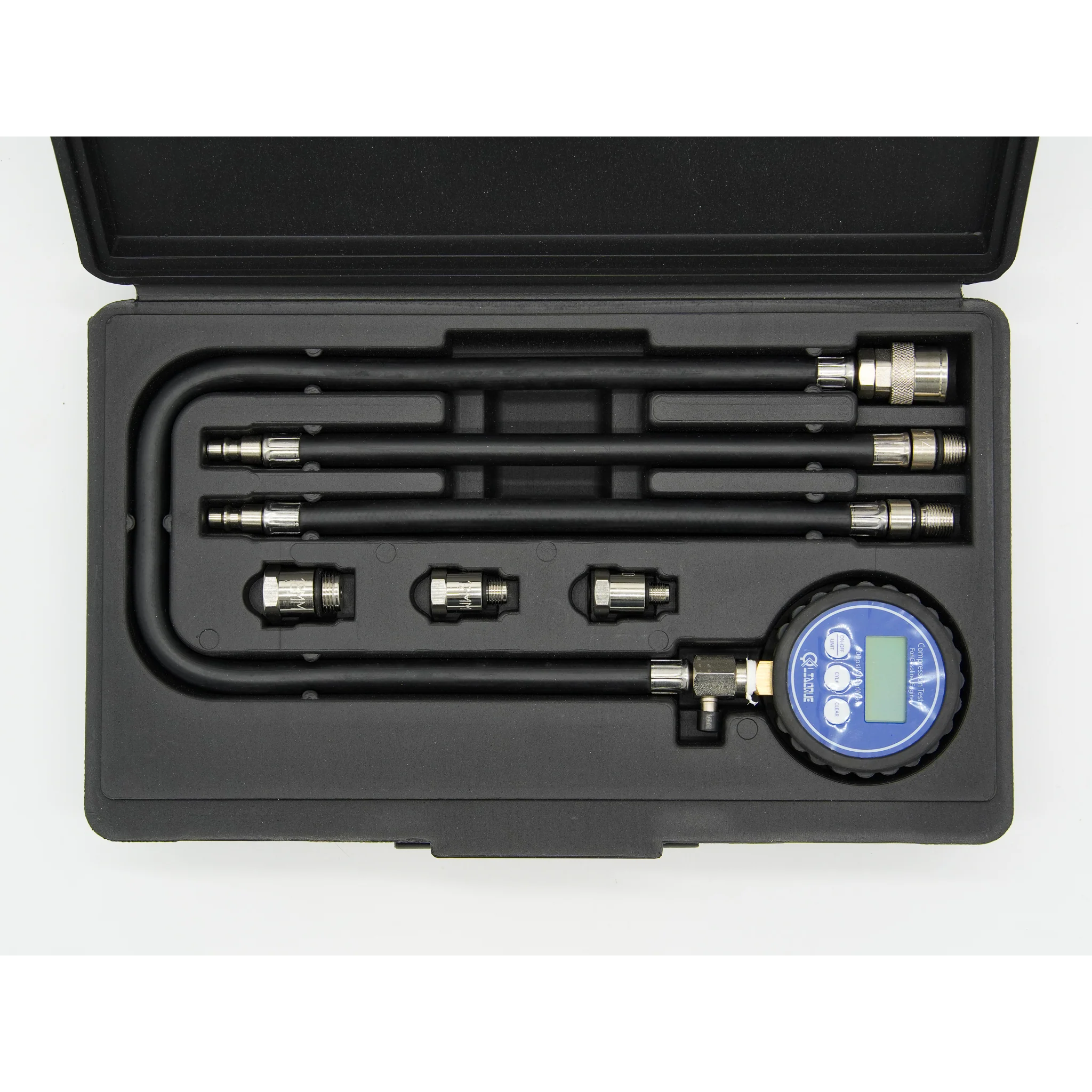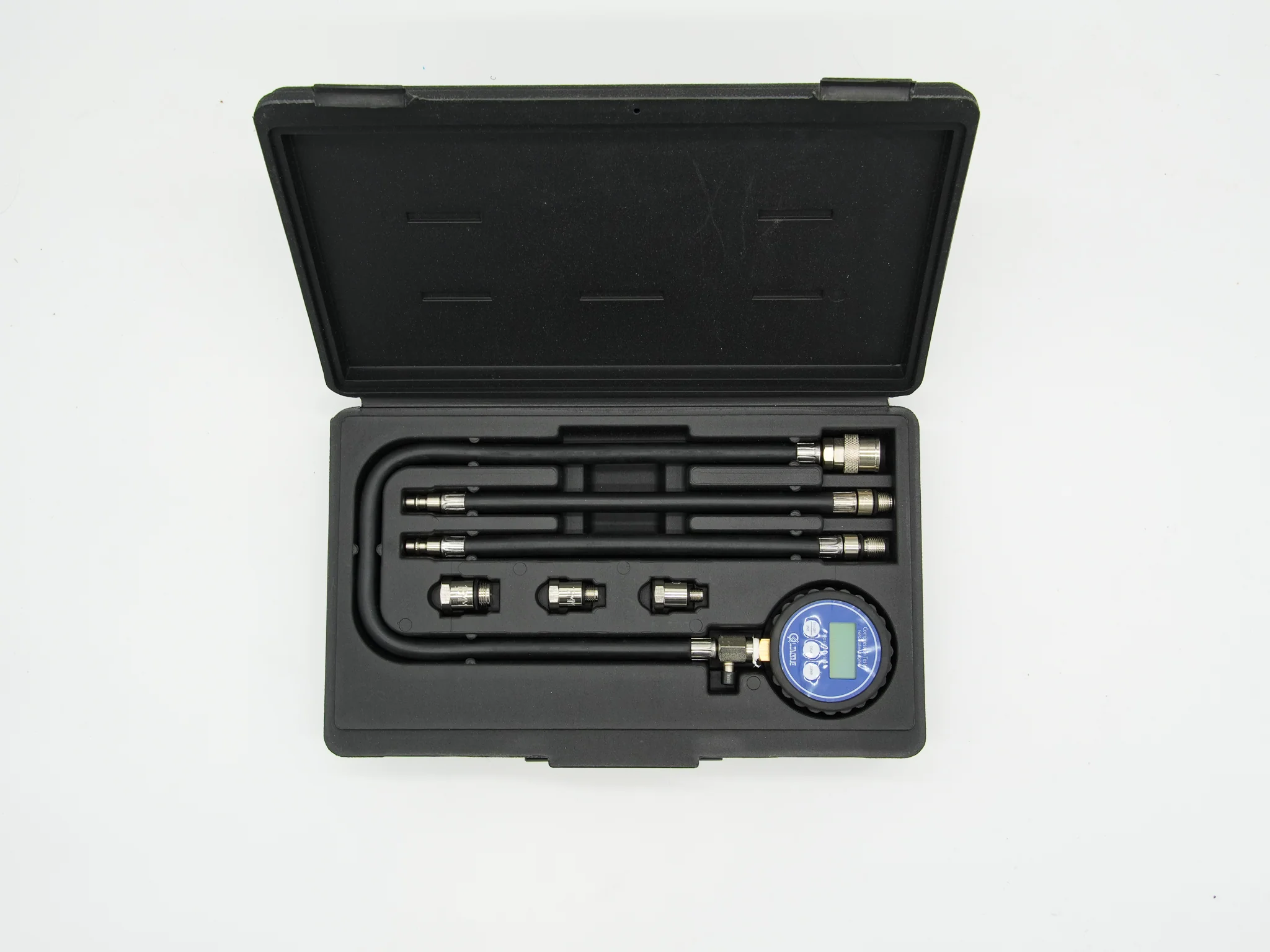 Tri fleksibilna produžna crijeva s brzim spojnicama osiguravaju sigurnu vezu između mjerača i cilindra. Pakiran u robusnom plastičnom kućištu, digitalni tester kompresije savršen je za radionice, mobilnu dijagnostiku i zahtjevne hobiste.