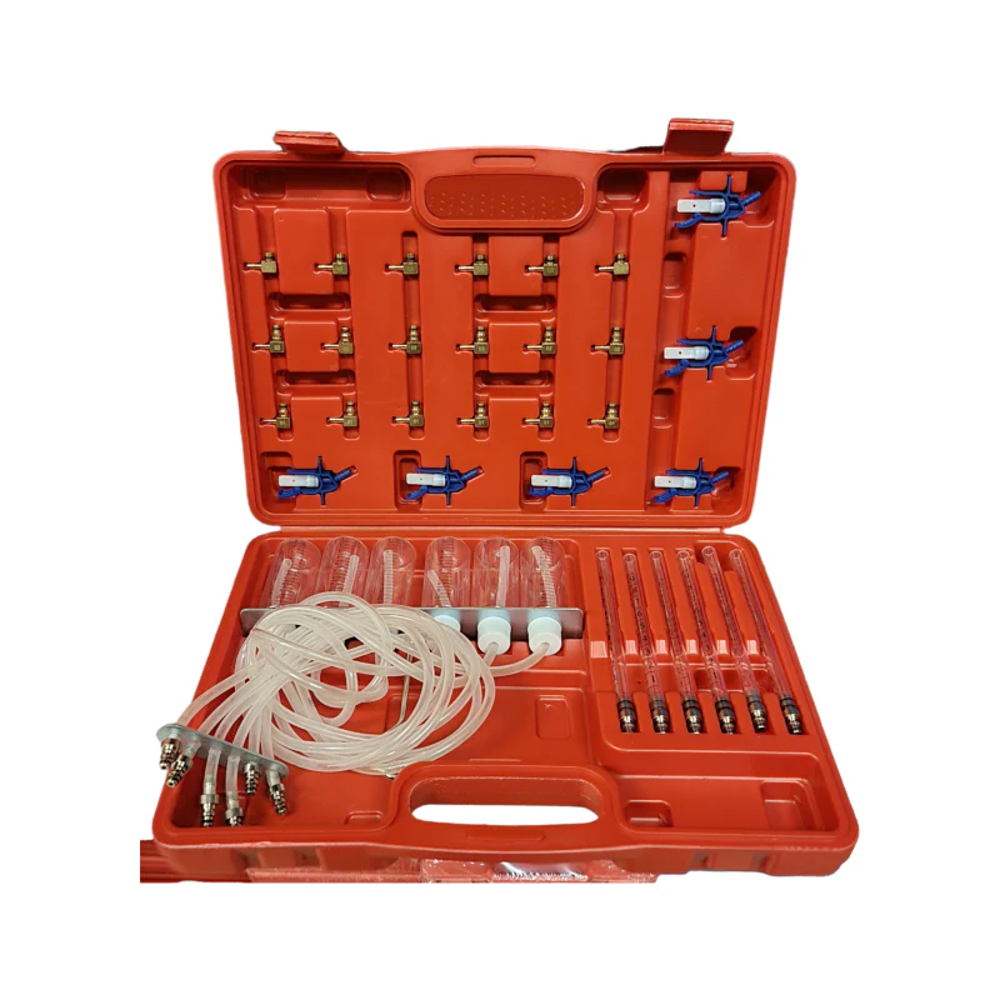 Set uključuje 18 adaptera (veličine 1, 2 i 3, 6 od svake veličine) , kompatibilnih s mnogim common-rail injektorima proizvođača kao što su Bosch, Denso, Delphi i Siemens. Sa 6 prozirnih mjernih cilindara , fleksibilnim povratnim crijevima i precizno zaključavajućim spojnicama, ovaj set je spreman za trenutnu upotrebu – idealan za istovremeno testiranje svih cilindara izravno u vozilu.