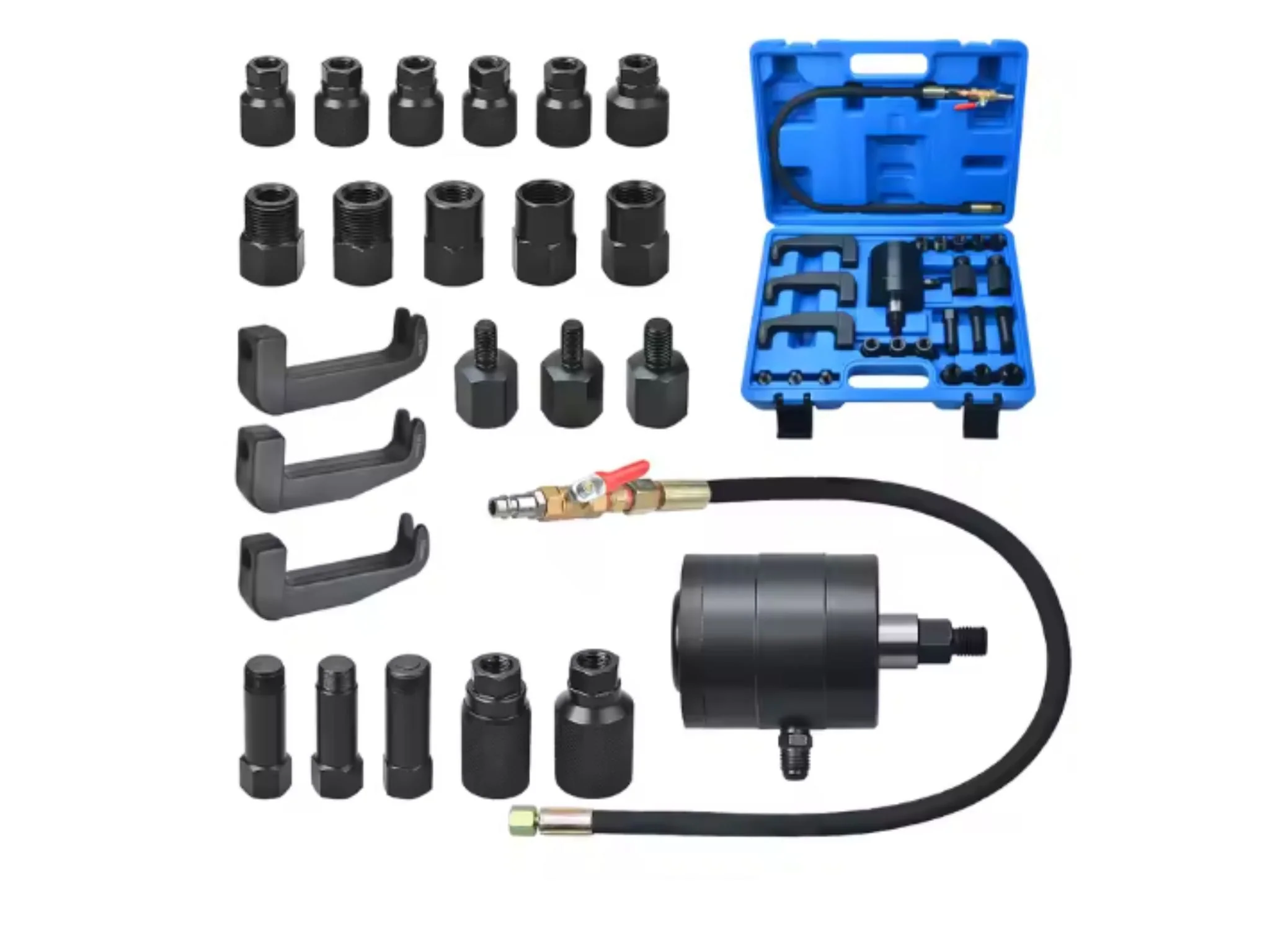 S ovim profesionalnim izvlakačem za dizelske injektore možete raditi brzo, snažno i bez oštećenja – čak i na zaglavljenim ili začepljenim injektorima. Set koristi komprimirani zrak za sigurno uklanjanje injektora iz glave cilindra kontroliranom silom. Bilo da se radi o Boschu, Densu, CAT-u, Cumminsu ili drugima – ovaj alat odgovara brojnim sustavima i tipovima motora zahvaljujući svojim svestranim adapterima.