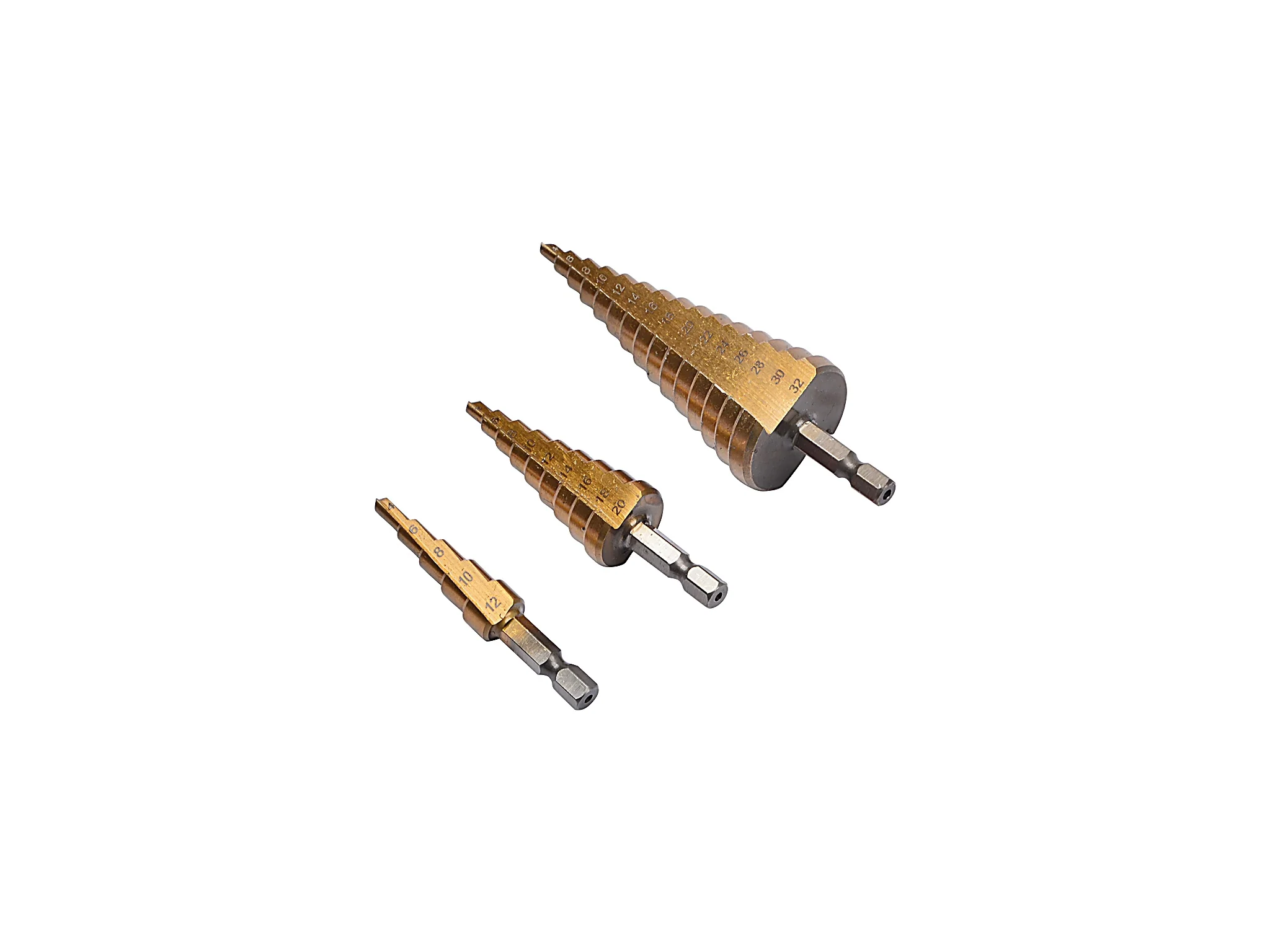 3 različita stepenasta svrdla – 4–12 mm, 4–20 mm, 4–32 mm